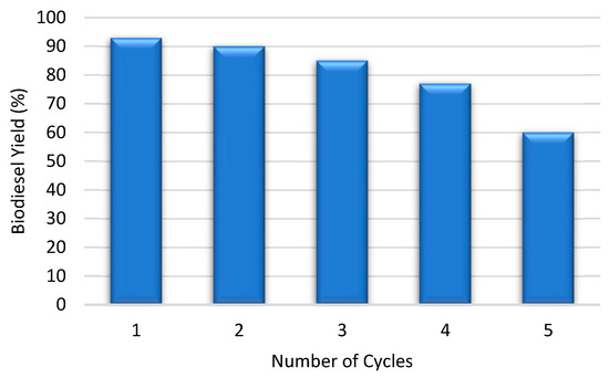 Nano-catalyst reusability is also an important aspect to make it cheaper and preferable over homogeneous and heterogeneous catalysts. The reusability test was carried out under optimized conditions, i.e., methanol to oil ratio 6:1, catalyst concentration 0.3 wt% at 75 °C temperature, and 2 h reaction time. After the phase separation process of biodiesel, the left-over catalyst was recovered by centrifugation of the reaction mixture at 3000 rpm for 10 min. Afterwards, the recovered catalyst was washed with hot distilled water, n-hexane solvent, and oven dried at 60 °C overnight followed by calcination at 500 °C for 3 h before use for the next cycle. The reaction cycle stopped when a significant decrease in biodiesel yield was observed. It is necessary to wash the catalyst to remove the attached molecules of reaction media at the catalyst surface [44].
