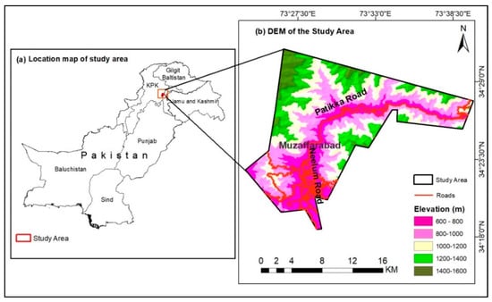 The area selected for the present study is Muzaffarabad, the capital of Azad Jammu and Kashmir. It is on the northern side of Pakistan, as shown in Figure 1a. Figure 1b indicates the Digital Elevation Model (DEM) of the study area, with a range from 600 m to 1600 m. It is the second largest district of AJK, with a total area of 1642 km2. The total population of Muzaffarabad District is 650,000 according to the census of 2017 []. It lies between 34.37° latitude and 73.47° longitude and is located at an elevation of 739 m above mean sea level []. The city is situated at the confluence of two rivers, i.e., the Neelum and Jhelum rivers. The Neelum District is north of Muzaffarabad, whereas the Bagh District forms the southern boundary. The terrain was disfigured by folding and faulting generated by orogenic stresses. The rocks found in the area include sandstone, siltstone, claystone, and conglomerates. It consists of a convex bulging of cultivated land close to its trace; tilting of man-made features/structures; the formation of ponds on the footwall as the hanging wall uplifted along the Muzaffarabad thrust and blocked the flow of streams running across its traces. Many of the associated landslides are distributed along the path of the Muzaffarabad thrust in the study area. The monsoon is the dominant weather, which leads to rain-induced landslides. The mean annual temperature ranges between 3 °C to 16 °C in winters, and 23 °C to 35 °C in summers. The area’s average yearly precipitation is 1511 mm, and the relative humidity is around 73%. Three main rivers are flowing through Muzaffarabad, which are the Neelum, Jhelum, and Kunhar rivers. The Neelum river merges into the Jhelum at Domail.