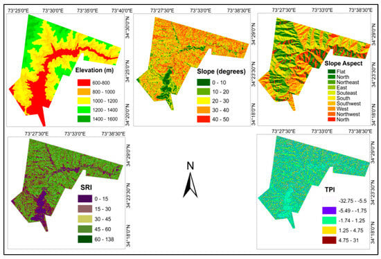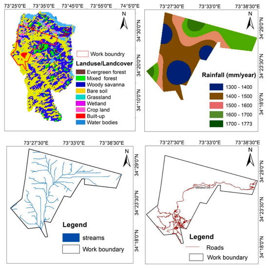 The LULC of the study area was classified into nine different classes which are: (i) evergreen needle leaf forest; (ii) mixed forest; (iii) woody savanna; (iv) bare soil; (v) grassland; (vi) wetland; (vii) cropland; (viii) built-up area; and (ix) water bodies (Figure 2). In the LULC map, 64.65% of the total area is covered by bare soil, and 3.02% is a built-up area. The areas covered by the classes of woody savanna, grassland, cropland, and mixed forest are 22.35%, 5.97%, 2.5%, and 0.71%, respectively. The elevation map was classified into five classes, which are: (i) 600–800 m; (ii) 800–1000 m; (iii) 1000–1200 m; (iv) 1200–1400 m; and (v) 1400–1600 m (Figure 3). The percentages of these classes are 8.83%, 14.36%, 18.87%, 18.97% and 38.95%, respectively. The classes of the slope are: (i) 0°–10°; (ii) 10°–20°; (iii) 20°–30°; (iv) 30°–40°; (v) 40°–50°; (vi) 50°–67.5°. The highest percentage area (30.52%) is covered by the slope class of 30°–40°. A total of 11.22% of the area is covered by 40°–50°, while the remaining classes, i.e., 0°–10°, 10°–20°, 20°–30°, and 50°–67.5° covered areas of 8.92%, 18.41%, 30.07%, and 0.84%, respectively. The classes of slope aspect are: (i) North (N) and Northeast (NE); (ii) East (E); (iii) Southeast (SE); (iv) South (S) and Southwest (SW); and (v) West (W) and Northwest (NW). The percentages of these classes are 19.32%, 10.12%, 15.51%, 29.01% and 26.01%, respectively. The classes of surface roughness index classes are: (i) 0–15; (ii) 15–30; (iii) 30–45; (iv) 45–60; (v) 60–138. The percentages of these classes are 9.21%, 19.91%, 31.10%, 26.6%, and 13.02%, respectively. The classes of topographic position index are: (i) −32.75–−5.5; (ii) −5.49–−1.79; (iii) −1.74–−1.25; (iv) 1.25–4.75; (v) 4.75–31. The percentages of these classes are 6.55%, 22.74%, 36.98%, 25.56%, and 8.15%, respectively. The classes of rainfall map are: (i) 1300–1400 mm/yr.; (ii) 1400–1500 mm/yr.; (iii) 1500–1600 mm/yr.; (iv) 1600–1700 mm/yr., and (v) 1700–1773 mm/yr (Figure 3). The percentages of these classes are 0.006%, 15.15%, 43.75%, 25.45%, and 16.21%, respectively. The buffer tool in GIS was used for both the drainage and road to create five classes, which are: (i) 0–40 m; (ii) 40–80 m; (iii) 80–120 m; (iv) 120–160 m; and (v) 160–200 m (Figure 2).