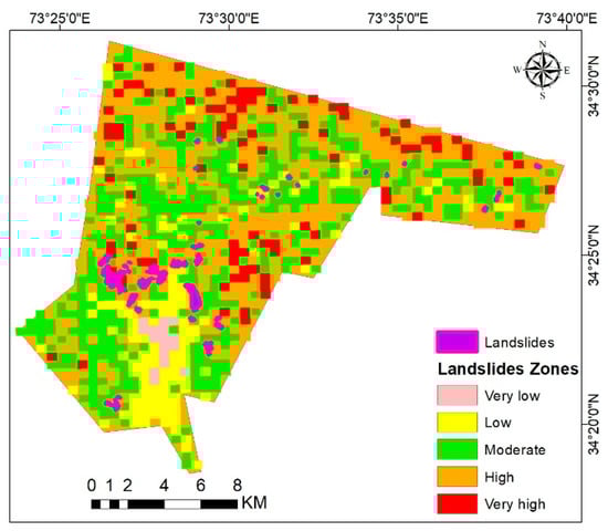 In the Pakistani Himalayan region, the landslide occurrence, from a small scale to almost heavy land sliding, could be related to climate, slope, landcover, and lithology [,]. The damages caused by landslides vary from region to region. Such damages affect the livelihood of people, tourism in the area, and the economy of the region. Several studies indicated that among all of the landslide-susceptible areas, the Kashmir Himalaya is the world’s most terrible landslide-affected region []. This can be well described when an earthquake measuring a magnitude of 7.6 on the Richter scale struck Azad Jammu and Kashmir (AJK) and Khyber Pakhtunkhwa (KPK) Province in northern Pakistan on 8 October 2005. It triggered many landslides and affected more than 30,000 km2 areas, which resulted in more than 25,000 fatalities []. Due to this earthquake, a landslide occurred in the Haitian-Bala region of AJK, which destroyed three villages and many deaths occurred. The intense rainfall and snowmelt during the spring and the monsoon are also the communal triggers of landslides in Muzaffarabad District of AJK. The researchers paid attention to landslide prediction and monitoring across scientific communities. The zonation of landslide hazards is critical for predicting and analyzing landslides [] and managing such disasters more effectively, particularly in the mountainous regions []. The landslide hazard zonation divides an area into various similar portions. It ranks them, based on the actual hazards caused by mass movement [], and it is an essential step before planning and disaster mitigation [].