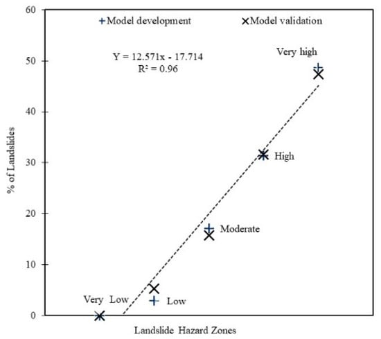 The spatial data of 35 landslides were used for model development, and the data for remaining 19 landslides were utilized for the model validation. The landslide hazard zone map, developed based on 35 landslides, was used in this validation. The landslides used for the model development and validation were overlaid on the landslide hazard zones to estimate the percentage of landslides in hazard zones. These percentages were used to determine the coefficient of determination.