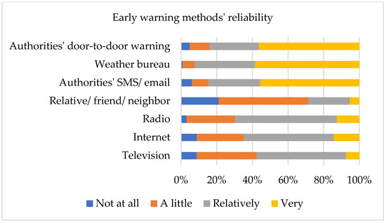 Figure 2 shows a variability of ratings in terms of reliability of the different sources of warning (official or not). Based on the respondents’ views, the weather bureau (the Hellenic National Meteorological Service) is the most reliable source of early warning. On the contrary, relatives were found to be the least reliable sources of early warnings in the eyes of the participants.