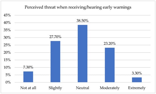 Furthermore, we explored the degree to which the participants feel threatened by the expected extreme phenomena upon receiving or hearing an early warning for their area. On a 1 to 5 scale (1 = not at all and 5 = extremely), they gave balanced answers, as 35% of respondents replied “not at all” (7.3%) or “slightly” (27.7%), whereas another 38.5% stated that they are “neutral”. Only 26.5% replied “moderately” or “extremely” (Figure 3).