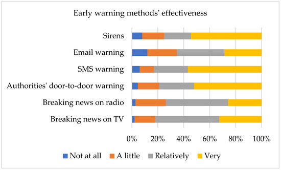 Concerning the perceived effectiveness of early warnings, we found that SMS warnings (56.80%), sirens (54.50%), and authorities’ door-to-door warnings (51.90%) are rated as very effective at higher rates. On the other hand, email warnings, and radio and TV breaking news were rated lower in terms of effectiveness (Figure 4).