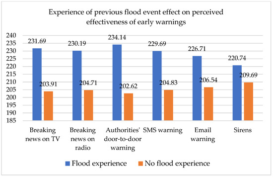 More specifically, the Mann–Whitney test’s results reveal that people who have experienced a flood event tend to have a higher level of perceived effectiveness concerning breaking news on TV (sig. = 0.016) and radio (sig. = 0.029), authorities’ door-to-door warnings (sig. = 0.006), and SMS warnings (0.025). Based on Figure 5, the highest statistically significant difference is recorded in the case of authorities’ door-to-door warnings. Moreover, we found that the higher the perceived knowledge of respondents on flood phenomena, the higher they perceived the effectiveness of TV-, radio-, SMS- and email-based early warnings (Table 5).