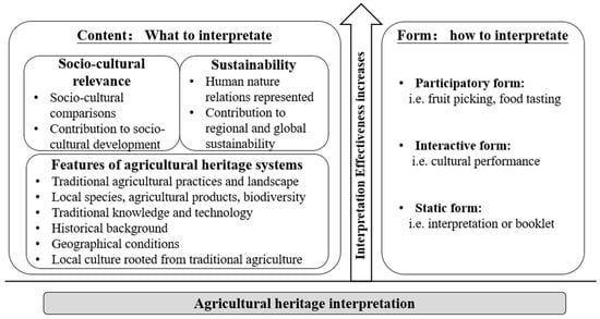 18]. Thus, the contents of agricultural heritage interpretation would need to include the historical, social, and cultural background, geographical conditions, diverse features of agricultural practices, products, and traditions. Particularly, how such systems represent the intricate human–nature relations and contribute to regional and global sustainability are critical aspects that should be interpreted.