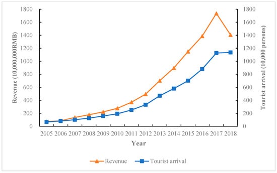Figure 2), with its value highly recognized, generates substantial economic and social benefits for the local community through provisions of multiple goods and services for tourists. The number of tourists grew from 0.67 million in 2005 to 7 million in 2018, and tourism revenue increased from 0.74 billion yuan in 2005 to 14.05 billion yuan in 2018 (as shown in