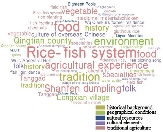 The word cloud analysis of interview transcripts shows that features of traditional agriculture, in particular the rice-fish system, agricultural products, and food experiences, were highly recognized among current heritage interpretation contents at Qingtian. Tourists demonstrated their interests and high evaluation of the rice-fish field experiences and local food tasting, such as Shanfen dumplings and Tanggao. However, tourist recognition of local cultural and natural resources was relatively low.