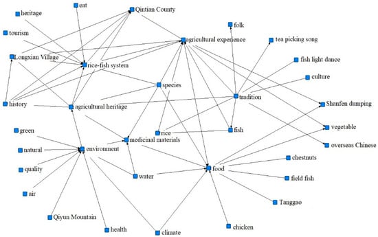 Figure 6 shows that “rice-fish system” is the first-level vocabulary, and “agricultural experience”, “food”, and “environment” are the second-level terms. Among them, “rice-fish system” is associated with “Qingtian County”, “Longxian Village”, “heritage”, and “tourism”. The term “food” includes “Shanfen dumpling”, “Tanggao”, “field fish”, and “vegetables”. It can be seen that tourists were more inclined to taste local food. However, the low centrality of the semantic network diagram reflects that tourist perceptions on the contents of agricultural heritage interpretation were relatively scattered.