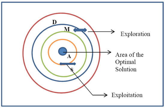 Step 3: Exploration—The exploratory operators of the AOA approach are the division (D) operator and multiplication (M) operator. The exploration mechanism identifies the near optimal solution that shall be obtained after numerous iterations. The exploration operators D and M operate to support the exploitation stage through an effective communication. High dispersion possibility does not allow these exploration operators to near the optimal solution easily.