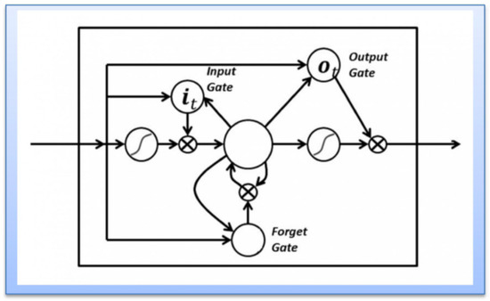 LSTM configures memory in the form of gated cell and this cell decides whether to store or delete the data from the network model. The decision is made by the gated cell based on the weight coefficients and the change of weights during the progressive training. The information with the higher significance will be retained in the LSTM memory during the training process and the others will be deleted moving towards achieving a better predicted value. Figure 3 presents the basic LSTM neural internal structure. The internal structures of LSTM are designed with three gated cell memories—an input gate for identifying and permitting the new inputs into the model, a forget gate for deleting the irrelevant information and the output gate for determining the final output corresponding to the current state.