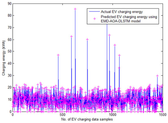 The novel predictor neural model proposed and simulated in this research study performed the prediction of charging demand energy level of the electric vehicles [64,65,66]. The charging demand was predicted with respect to the charging time taken, charging energy in kWh, greenhouse emission savings, gasoline and the cost incurred for saving. With respect to the EV charging station considered in this research study, the EMD–AOA–DLSTM model resulted in better prediction accuracy and minimal mean square error during both training and testing process.