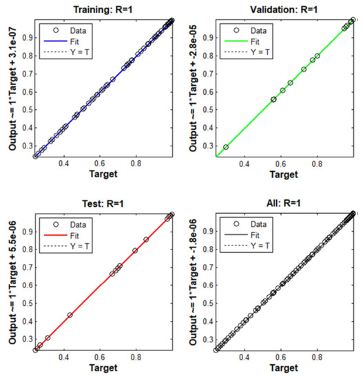 The Taylor diagram is another option to graphically summarize the proximity between the trained and tested data. The similarity between the two datasets is quantified in terms of their correlation, their root mean square error and the standard deviations. The Taylor diagram is widely used to understand the performance of various complex models used for prediction. Any model which has relatively high correlation and low RMSE will be marked as OBS in the X-axis of the Taylor diagram. The RMSE calculated using Equation (24) and the correlation value are used to arrive at the observed (OBS) value. The standard deviation of the test data can be related to the radial distance from the origin of the plot.