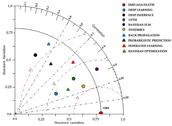 It may be inferred from Figure 15 that any model which has high correlation and low RMSE will be declared as the successful prediction model. Accordingly, both the Bayesian ELM model (violet dot) and the probabilistic prediction model (brown triangle) has high RMSE, but low correlation. Similarly, the federated learning (red triangle) model has a better RMSE and correlation. It was followed by the ensemble learning model (yellow dot) followed by the LSTM model (green dot) and the Bayesian optimization (green triangle). As far as the deep inference framework (black dot) and back propagation (blue triangle) are concerned, both have performed very poorly in establishing both correlation and RMSE. The deep learning (blue dot) model performed reasonably. Finally, the proposed EMD–AOA–DLSTM predictor (red dot) is demonstrated for its superiority based on the performance metrics by achieving relatively high correlation and low RMSE, as depicted in the Taylor diagram.
