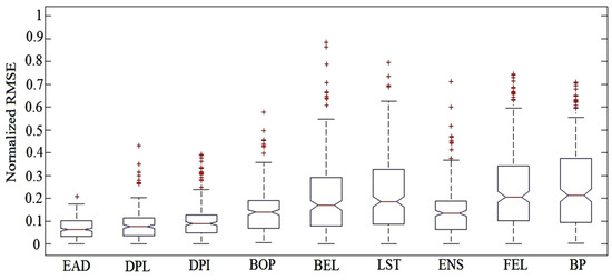 Another widely adopted statistical plot to establish the comparison of prediction errors of various prediction models is shown in Figure 16. The normalized RMSE is plotted for all the prediction models listed in Table 8, including the proposed EMD–AOA–DLSTM prediction model. The box plots are comprised of five components to portray the error statistics. Accordingly, the box plot is shown here, such that the box conveys the range in which the prediction error is attained by the prediction models. The black lines show the median absolute error and the + signs conveys the prediction error outliers. For clarity in the figure, the different predictor models are abbreviated as follows: EAD: EMD–AOA–DLSTM; FEL: federated learning approach; ENS: ensemble learning; BOP: Bayesian optimization with ML; LST: LSTM model; BP: back propagation model; DPI: deep inference framework; DPL: deep learning model; BEL: Bayesian ELM neural model.