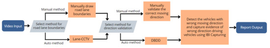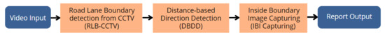 The three proposed sub-systems in the WrongWay-LVDC framework were developed as a prototype software application using Python [25] programming language. This developed framework can be tested using command lines in the Linux operating system [26]. The execution pipeline of this framework is shown in Figure 2. It is a one-time execution system, meaning that once we execute the framework, all sub-systems will be executed after one another, as shown in the pipeline. More information about the framework execution steps and versions are explained in detail in Section 2.5. The main idea, input, parameter, algorithms, and experimental results of our work are explained in the following sections of this paper. The first sub-system using the proposed improved RLB-CCTV algorithm is explained in Section 2.2. The second sub-system, the DBDD algorithm, is explained in Section 2.3. Lastly, the third sub-system, the IBI capturing feature algorithm, is explained in Section 2.4.
