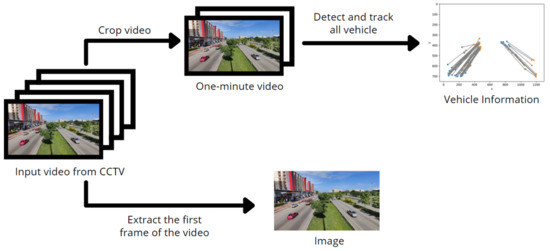 The input videos will be further analyzed, processed, and transformed into two other forms of inputs: An image input and vehicle information. In Figure 4, we show the system flow of how our system can generate more data originating from a CCTV video.
