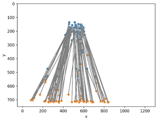 Vehicle information is a record of each vehicle’s start and stop locations within a video frame. There are three steps to obtain this input. First, crop the first one minute out of the main input video. Second, detect and track all vehicles moving inside the video frame regardless of the road lane. In this work, we use YOLOv4-Tiny for the object detection algorithm. YOLOv4-Tiny is an enhanced version of YOLOv4 [28]. It is smaller and suitable for running on small embedded systems. For the tracking algorithm, we chose the FastMOT algorithm [29]. FastMOT is improved from the Deep SORT tracking algorithm, where it is revised to be more suitable to run on small devices without bottleneck issues. The technique of FastMOT is to run the detector and feature extraction every N frame and use KLT to fill the gap efficiently. After all the vehicle has been tracked, the output will look like the image shown in Figure 5, where the plot is the summary of all movement vehicles within the time length of one minute. The orange dots inside the plot graph represent the location where each vehicle ID first appears inside the video frame or the start points. The blue dots represent the last location of the vehicle ID that has been tracked before the vehicle left the video frame or the stop points. The black lines link between the orange and blue dots, which represent the movement direction of each vehicle. Figure 5 shows that there is one road lane appearing in this video frame, where most of the vehicle in the lane is driving downward.