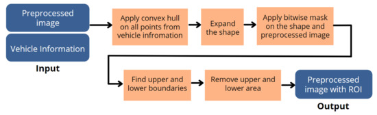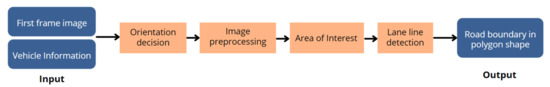 The improved RLB-CCTV consists of four main parts: orientation decision, image pre-processing, identifying areas of interest, and lane line decision. The inputs of this algorithm are image input and vehicle information. The system flow of the overall algorithm is shown in Figure 7.