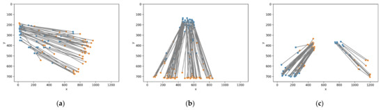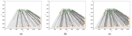 The vehicle information was obtained after detecting and tracking all vehicles in the video for one minute. (a) Horizontal orientation; (b) Vertical orientation; (c) Vertical orientation with two roads.