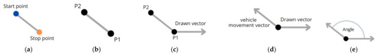 Step to obtain the vectors to find the angle (a) Obtain vehicle information as an input; (b) Set the lower point to be P1 and the upper point to be P2; (c) Draw a vector to the right where the initial point is P1; (d) Obtain the vehicle movement vector from P1 and P2; (e) Find the angle in degree.