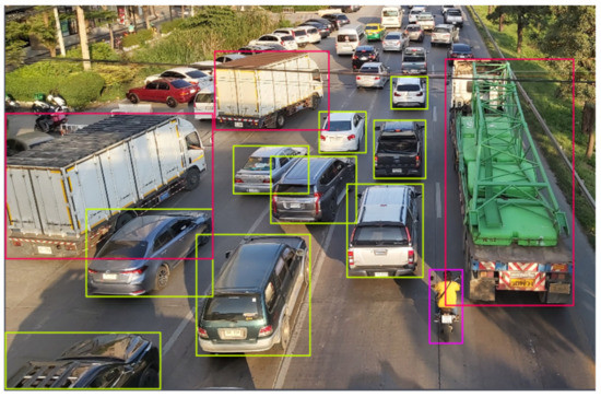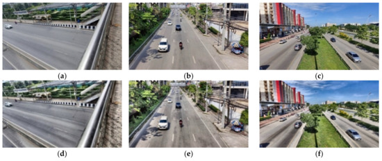 The second case is when there is heavy traffic. During rush hours, we often face bad traffic, where all vehicles on the road move slowly or do not move for a certain time. As the system’s default requires one minute video for the validation part, in the case of traffic jams, the distances of each moving vehicle in the video might be too short, and the system might not obtain the significant information to validate the correct direction of a road lane. In the case that the vehicle is moving slowly in the video length of one minute, for the MBCDD algorithm, this case would not affect the efficiency of the system to validate the correct moving direction because even the tiny direction movement is sufficient for the system to understand the majority moving direction of all vehicles. However, this will severely affect the validation part of the DBDD algorithm since the algorithm will divide the road into two areas, the start and stop areas. If the vehicles do not have enough time, within one minute, to drive across from the start area to the stop area, the system will fail to validate the correct direction. However, this situation can be solved by increasing the time for the validation video, depending on the time of the day of the video that is selected to be the validation video. The system should avoid using the video during rush hour to validate the correct direction. If it is unavoidable, the longer length of the video, such as 3 or 5 min, should be used to validate instead, as this will be a solution for the system to obtain more accuracy in direction validation.