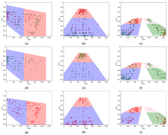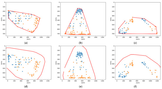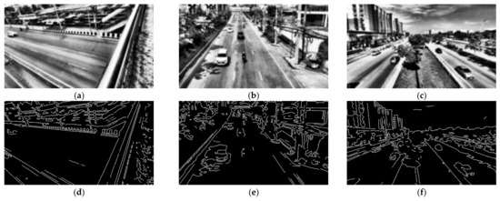 The first step in the improved RLB-CCTV algorithm is to determine the angular orientation of the input video, to detect whether the lane is aligned horizontal or vertical. The pseudocode of this step is represented in Algorithm 1. The input of this step is the vehicle information, as shown in the examples in Figure 8a–c.