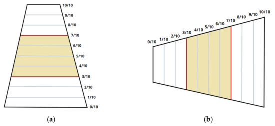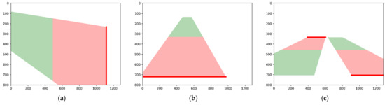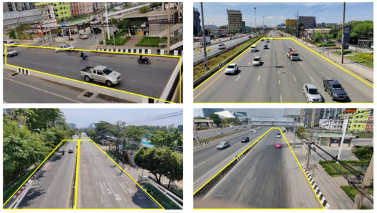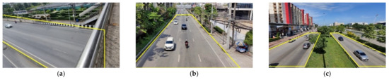 According to the reviewed research, their approaches were designed for ADAS. Our research has a different purpose as we design for the CCTV camera angle. The setting of the CCTV camera mostly has a high and center position to view the road at a clear angle. With this position, the CCTV will see the road aligned vertically, as shown in Figure 6a,b. Moreover, we also consider another case where the CCTV is installed on the side of the road, which will make the angle the CCTV see the road aligned horizontally, as shown in Figure 6c.