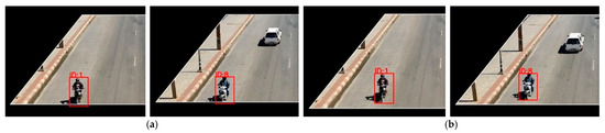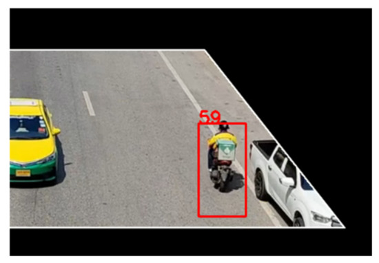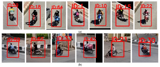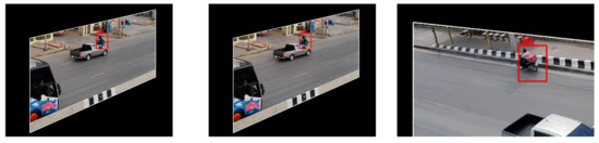 The IBI capturing feature algorithm is used to capture the most precise image, capturing the closest moment where the vehicle comes closest to the camera. Figure 36 shows screenshot images cropped to the size of a vehicle that drives in the wrong direction. Figure 37a,b show the example captured images with IBI capturing features when vehicles are driving in vertical and horizontal orientations, respectively. As we mentioned in the problem statement and the motivation for this research, the motorcycle is the major type of vehicle that often be found driving in illegal directions on road lanes in Thailand. Therefore, we only focus on detecting the motorcycles in this research. Although there are some cases where other types of vehicles (e.g., car or truck) are found when driving in the wrong direction, we do not have sufficient images of those cases captured in our video records for the experiments.
