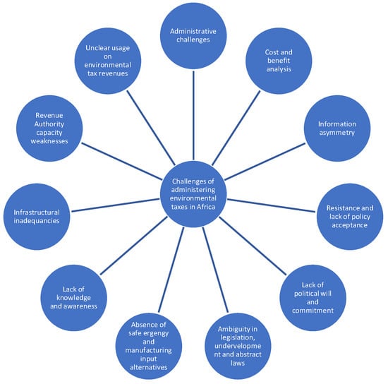 Figure 3 foregrounds the discussion on the problems faced in levying green taxes in African countries. Belletti [] argues that the implementation and effectiveness of environmental taxes in African countries is unfavorably affected by the lack of adequate infrastructure and administration capacity, weak institutions, and public perceptions on political institutions. The researcher further alludes to factors such as regressivity possibilities due to high inequality and poverty, possibilities of negative effects on economic development and the likelihood of investment flight, tensions with respect to environmental policy and economic development, low administration capacity and lack of resources as well as the high dependence on fossil fuels.