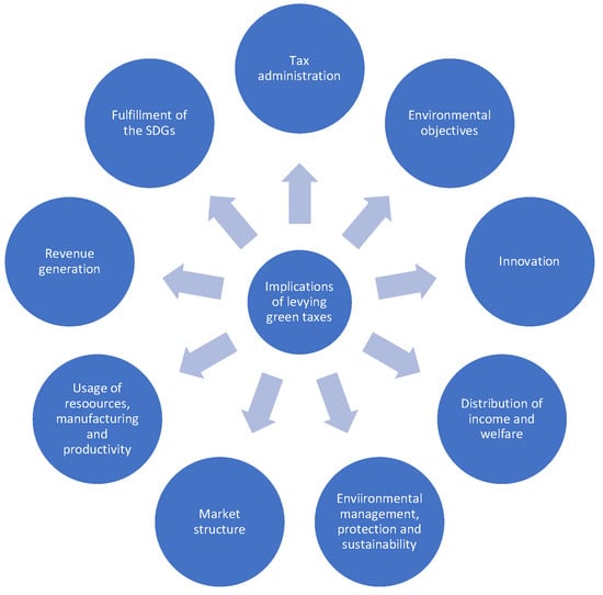 Low-income households suffer the most from the impacts of climate changes and environmentally unfriendly activities such as pollution, gas emissions and other adverse externalities. Therefore, addressing these negative externalities through environmental taxes and other market-based measures must take into cognizance the needs of society and the economy, improve social fairness and at the same time protect the environment. It is also important to pay attention to the revenue mobilization objective, especially how the eradication of fossil fuel subsidies could complement this objective. The outcome must be such that those who use more, waste more or pollute more pay more accordingly, although this is not always the case. Green taxes have both positive and negative implications. These are also influenced by the effectiveness of the tax collection system, its efficiency, transparency, and accountability in relation to green taxes. Different researchers pointed out an array of possible ramifications of levying green taxes. These include consequences on economic growth, revenues, income and distribution, social development, consumption and production patterns, income inequality, energy use, GDP, poverty reduction and fuel usage as well as on the double dividend expectations and the SDGs []. The findings of the review and the implications are presented in Figure 5 and followed by a brief discussion of each implication.