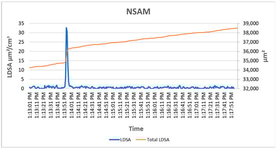 - Nanoparticle surface area monitor (NSAM mod. 3550, TSI Inc, Shoreview, MN, USA) for the measurement of lung deposition surface area (LDSA) of particles, which is an important occupational parameter, corresponding to the active surface area calculated as the product of the particle area for the probability density of deposition in the different zones of the respiratory tract (A, alveolar or TB, tracheobronchial), according to the model published by the ICRP [26].