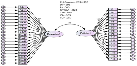 The questionnaire’s construct validity was also verified using a CFA, where the adopted model for the relationship of the questionnaire items was drawn. The CFA was performed using SEM with AMOS, version 24.0. Maximum likelihood method estimates were used to estimate the parameters, as shown in Figure 1.