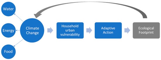 Action taken in response to climate change and its lead vulnerabilities of WEF shortages at a household level in an urban area depends on the households’ adaptive capacity. Figure 1 is a simplified diagram of the pathways showing how urban vulnerability is expected to affect adaptive actions to WEF shortages and environmental implications. Climate change has a direct influence on water, energy, and food at the household level. It exerts added stress on urban areas through intense droughts, heat waves, and floods, compromising WEF supplies.