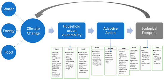 This article places emphasis on household vulnerabilities and adaptive actions because this is where serious WEF challenges are faced, with the poor bearing the brunt of environmental risks [31]. It is at a household level that consumption patterns, a system of governance, performance of normal daily activities, and service provisioning affect the environment either positively or negatively [16,32,33,34]. Excessive exposure and limited adaptive capacity to climate change in cities is risky, in particular for the vulnerable poor in developing countries [18]. Studies revealed more vulnerability to heat-related distress mainly in densely built-up areas with low-income groups, exposing residents to, among others, energy and water shortages in Harare [35].