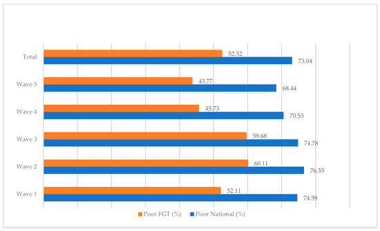 Figure 1 shows that, using the national poverty lines, 73.04% of the refugees were poor across the different data waves, while 52.52% were poor using the FGT poverty line. The proportions of the refugees that were poor steadily declined from 76.55% during wave 2 (July–September 2020) to 68.44% during wave 5 (March–June 2021) using the national poverty lines. A similar trend was also observed for the FGT poverty line. The results in Table 2 shows the poverty levels among refugees across selected demographic characteristics. Focusing on poverty estimates that are based on the national poverty line, the results revealed that poverty was slightly higher among rural dwellers (74.00%) than their urban counterparts (70.01%). Based on the two poverty measures, there is a significant difference in poverty incidences across urban and rural areas (p < 0.01). The incidences of poverty also increased from 39.34% for refugees with one member to 95.72% for those with 10 members. Based on the two poverty measures, there is also a significant difference in poverty incidences across household sizes (p < 0.01). Based on gender, poverty was slightly higher among female-headed households (73.32%) than the 72.82% for male-headed households. There is no significant difference in poverty incidences across gender (p > 0.10) based on the national poverty line. However, with the FGT poverty measure, a significant difference was found (p < 0.01). Across the refugee camps, the respondents from Kalobeyei and Kakuma had the highest poverty incidences, of 89.50% and 83.10%, respectively. However, poverty incidences were highest among those with tertiary (78.34%) and secondary (77.43%) education. Based on the two poverty measures, there was a significant difference in poverty incidences across the different educational levels (p < 0.01).