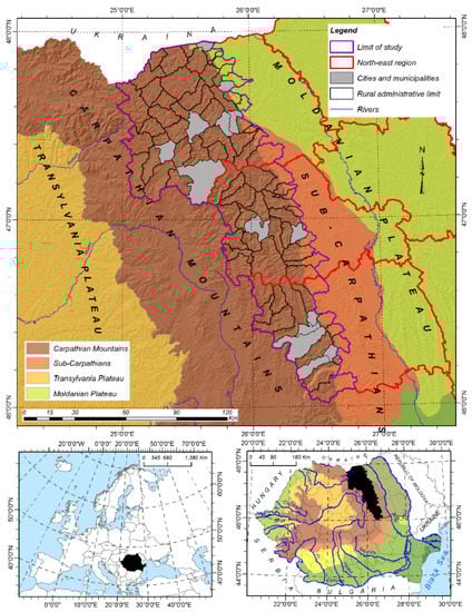 The study area, represented by the mountainous rural area of the North-East Region of Romania, includes 78 communes belonging administratively to the counties of Suceava, Neamț, and Bacău (Figure 1), with an area of 10,090 km2 (27.38% of the region) and 359,579 inhabitants; 9% of the population of the region (National Institute of Statistics, etc.).
