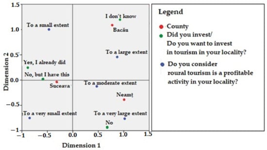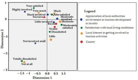 Data analysis methods included quantitative analysis, systematization, comparison, use of correlation models and multiple linear regression [110], and multivariate data analysis—Factorial Analysis of Multiple Correspondences (AFCM) [111], and the software used was SPSS 23.0. The results were translated into a synthetic profile of the area that highlighted the positive or negative perceptions of the population towards the researched elements, as well as the intention to be involved in the future in tourism entrepreneurship.
