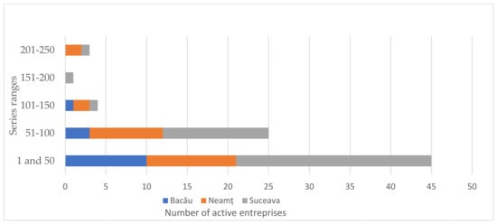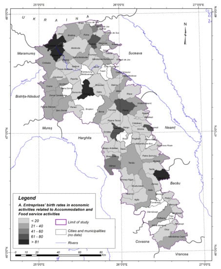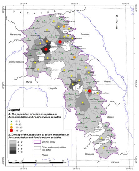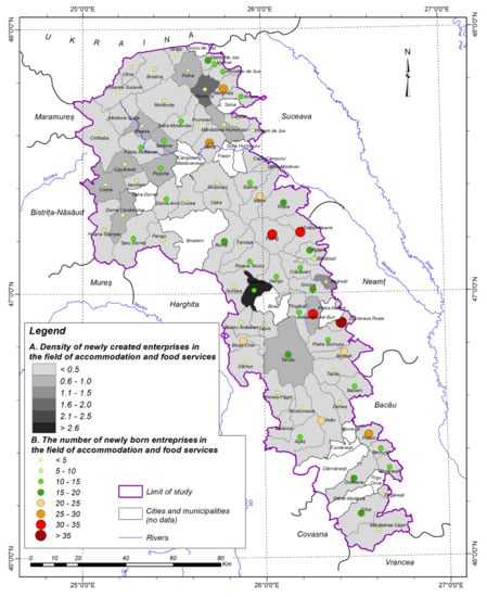 To highlight the entrepreneurial activity in the North-East Region of Romania and the study area, for 2019, data from the eDemos statistical database of the National Institute of Statistics were used for the following indicators of entrepreneurial activity: the total number of active enterprises(the population of active enterprises)and the total number(population) of enterprises active in the field of accommodation and food; the number of newly created (born)enterprises in the field of accommodation and food. Data were aggregated at the municipality, county, and study area levels using Microsoft Excel. The density of active enterprises was calculated according to the formula (total number of active enterprises based on the locality/number of inhabitants) × 1000, and the density of newly created enterprises was calculated according to the formula (total number of newly created enterprises based on locality/number of inhabitants) × 1000. The start-up rate of new enterprises was calculated as the ratio between the number of newly created enterprises and the number of active enterprises, multiplied by 100).