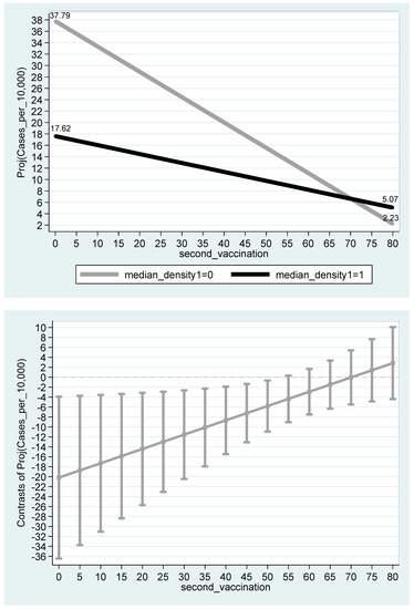 Table 2 reports regression outcomes, based on Prais-Winsten regression for spatial autocorrelation. To obtain estimation outcomes, we employed Stata 16.1 software package. Figure 1 (top) describes the projected scope of COVID-19 morbidity vs. the percent of vaccinated persons for densely populated (equal to or above the median population density of 2388 ) and sparsely populated (below the median population density of 2388 ) cities and towns.