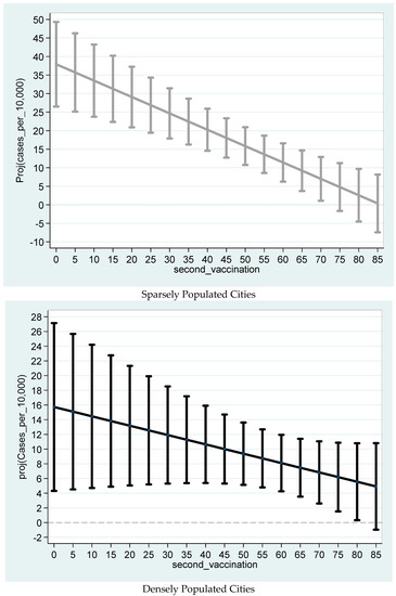 The outcomes show that for both city density types, the projected scope of morbidity drops with a higher level of vaccination. Yet, the pace of the decline is attenuated in densely populated cities. While the anticipated drop in sparsely populated cities is from 37.79 COVID-19 cases for zero percent of vaccination to 2.23 cases per 10,000 persons, the equivalent figures for densely populated cities are from 17.61 to 5.07 COVID-19 cases, respectively. The intersection point between the two lines is given at a vaccination rate of 70 percent, and the scope of morbidity at the intersection point is 6.69 cases per 10,000 persons. (This intersection point is calculated as follows: The estimated equation in Table 1 is: . Substitution of yields: (1) (the regression line for 46 densely populated cities). Substitution of gives: (2) (the regression line for 46 sparsely populated cities). Solving the system of Equations (1) and (2) yields (70.035, 6.6945)).