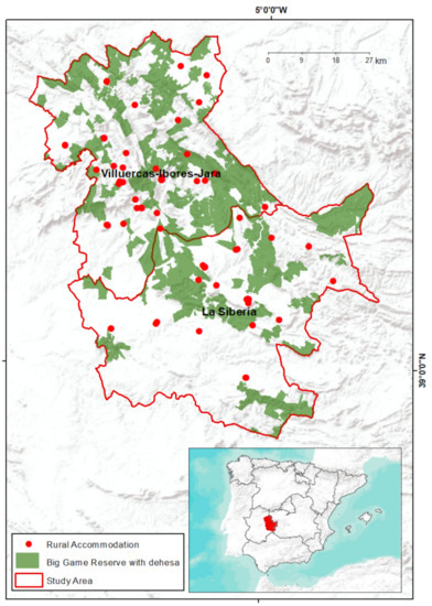 The study area is geographically located in the Spanish regions of Siberia and Villuercas-Ibores-Jara (Figure 1). Specifically, it focuses on the rural tourist lodgings [25] located in both territories, which, in turn, are located at an optimum distance (5 km) from the big game hunting areas located on the dehesa pastures present in the study area. The optimum distance is 5 km because it is estimated that lodges located at this distance have a greater influence on the hunting resource.