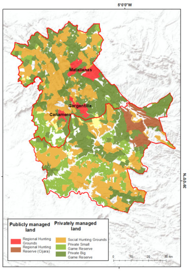 According to the classification of hunting grounds dictated by Extremadura legislation [27], Figure 2 shows the different typologies existing in the study area. It also identifies a series of hunting grounds that can be grouped according to their management in two typologies: public or private. The first of these groups includes regional game preserves and regional game reserves. The regional preserves are intended to guarantee equal opportunities among hunters, with special attention to those from Extremadura, whereas the regional hunting reserves are characterized by their exceptional hunting characteristics, and their declaration responds to the objective of guaranteeing their conservation. In this type of land, hunting practice is reduced to an annual public lottery carried out by the Regional Government of Extremadura. The number of permits granted in the last allocation [28] was 51 for national hunters and 202 for regional hunters. The study area includes the three regional hunting reserves existing in the Autonomous Community of Extremadura (Matallana, Cañamero, and Gargantilla) and one of the two regional hunting reserves (Cíjara), confirming the great hunting singularity of these territories. To this must be added the large number of lands managed by gamekeepers, distinguishing between those that do not have a lucrative purpose and those that pursue an economic goal. The first of these cases includes the so-called social preserves. This type of land is managed by groups of hunters residing in a locality under the figure of local hunting societies. On the other hand, there are private hunting preserves, whose management is carried out by the owners or lessors of these lands with a clear objective: the economic exploitation of hunting resources. The private hunting preserves, in turn, respond to different subcategories that determine the form of exploitation of each one, being grouped in a general way as those dedicated to big game and small game.