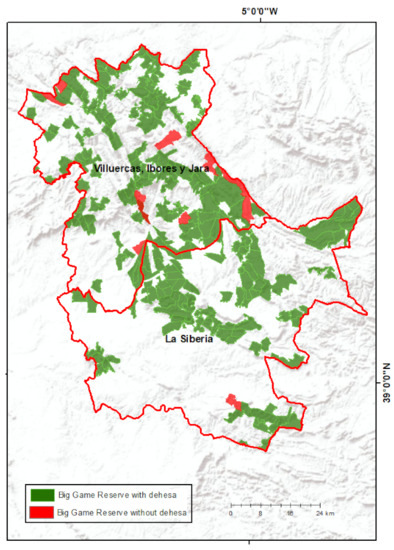 At the same time, the dehesa has an outstanding prominence among the reserves dedicated to big game hunting, as can be seen in Figure 3. It occupies 94.9% of the surface area of the reserves, although it has a lower incidence in the Villuercas-Ibores-Jara region.
