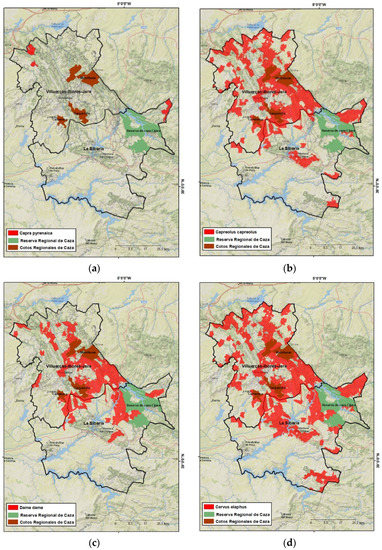 Distribution of big game species in the study area: (a) Capra pyrenaica; (b) Capreolus capreolus; (c) Dama dama; (d) Cervus elaphus; (e) Sus scrofa.