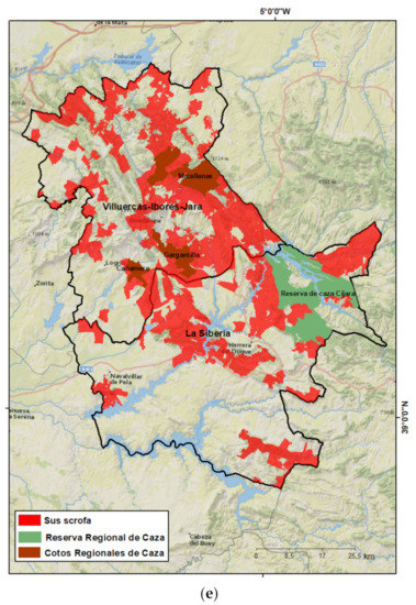- Sistema Territorial de Extremadura, (SITEX). Cotos de Caza. Available online: http://sitex.gobex.es/SITEX/centrodescargas/viewsubcategoria/56 (accessed on 15 June 2022).