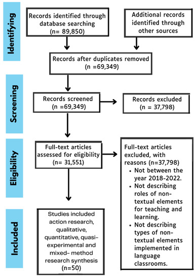 The keyword searches generated 89,850 results as shown in Table 1. And includes redundant articles found from many searches. From the results, 37,798 articles were excluded, with 31,551 articles with full-text access remaining. The compiled articles were selected using two stages of evidence screening, following Moher et al. (2009) [26]. In the first stage, the titles and abstracts of the identified articles were screened. The abstracts were obtained to ascertain their relevance to the present topic. In the second stage, the full texts of the reviewed articles were screened. The inclusion criteria required articles retrieved from peer-reviewed publications, which were written between 2018 and 2022. Following this, the articles from 2018 to 2022 were selected for open-access criteria. Time-range decisions are important from a practical perspective in scoping reviews. Despite the topics of the articles being presented in different formats, an extra inclusion requirement was applied to ensure that the articles were relevant to the scope of the review. Therefore, all the theoretical articles were included in the review, such as the literature reviews and recommendations based on cited research, and the empirical articles, such as qualitative, quantitative, action research, or mixed-methods studies. The exclusion criteria were expressed during the article screening process to remove those articles that did not precisely emphasize the roles and methods used in non-textual elements as supporting materials in sustaining the learning of ESL and EFL learners. In this stage, an article was excluded from the review if exclusion criteria were fulfilled: first, if the article was not published between 2018 and 2022; second, if the article did not describe non-textual elements’ roles in language learning activities. The articles were screened based on how the roles of non-textual elements changed in sustaining the teaching and learning of ESL and EFL in relation to the types of non-textual elements used in language classrooms. After applying the criteria, 50 articles were selected to be included in the current review.