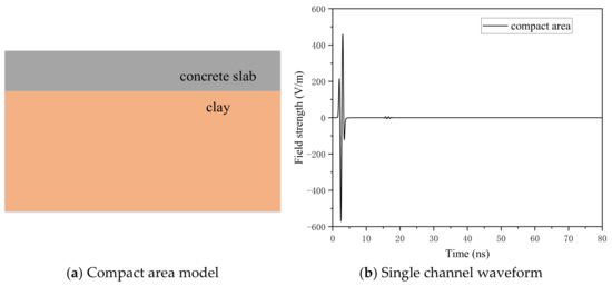 As shown in Figure 10, the high-frequency electromagnetic waves reach the incompact area at about 24 ns and forms multiple reflection waves. For 0% repair and 50% repair, the reflection waveform of the incompact area basically overlaps before 30 ns, and the reflection amplitude of before repair is bigger than that of 50% repair after 34 ns. At 30–34 ns, because the propagation speed of electromagnetic waves in air is higher than that of polymer, the depth of the soil foundation that is reached at the same time is greater than 50% before repair, and the energy consumption of electromagnetic waves before repair is greater than 50% repair, so the reflection amplitude of 50% repair is greater than that before repair. After passing through the incompact area, the energy consumption of electromagnetic waves after repair is greater than that before repair. For 100% repair, the reflection amplitude of a single channel wave is significantly less than that of before repair and 50% repair, and the occurrence time of the reflection wave is later than that of before repair and 50% repair. Figure 9 and Figure 10 show that the amplitude of the reflection wave and the top amplitude of the curve before and 50% repair are greater than that after repair. Therefore, the degree of polymer diffusion in the incompact area can be evaluated by the forward simulation profiles and the single channel waveforms.