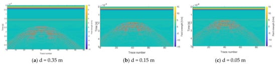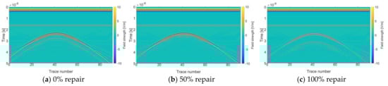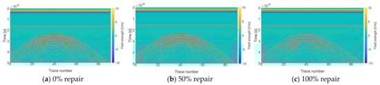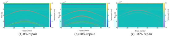 As shown in Figure 3a,c, the forward simulation profile presents two clusters of the hyperbola. Before repair (0% repair), the top amplitude of the lower hyperbola is greater than that of the upper hyperbola, while after complete repair, the top amplitude of the lower hyperbola is less than that of the upper hyperbola. The interval between two clusters of hyperbolas before repair was significantly longer than that of 100% repair. As shown in Figure 3b, the forward simulation profile of 50% repair presents three clusters of the hyperbola, the amplitude of the middle hyperbola is bigger than that of the lower hyperbola, and the amplitude of lower hyperbola is bigger than that of the upper hyperbola.