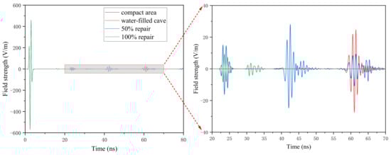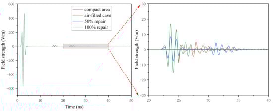 As shown in Figure 4, the A-scan images of the compact area model do not generate reflected waves after passing through the interface between the concrete and clay medium. The A-scan images of the water-filled cave with 0% repair and 100% repair show two reflected waves, but the time and amplitude are different. For 0% repair, the reflection waves of the water-filled cave appear near 23 ns and 61 ns and the amplitude of reflection wave is bigger than that of 100% repair. This phenomenon is consistent with the occurrence time and the top amplitude of the reflection hyperbola in Figure 3a,c. For 100% repair, the reflection waves of the water-filled cave appear near 23 ns and 31 ns, and the amplitude of the reflection waves are less than that of 0% repair and 50% repair. The A-scan images of the water-filled cave with 50% repair shows three reflection waves, which appearing near 23 ns, 42 ns, and 61 ns, respectively. The amplitude of the middle reflection wave is bigger than that of the first and third reflection waves, and the first and third reflection waves show reverse phenomenon. The time and amplitude of the reflection wave also corresponds to the top amplitude of the three hyperbolas that are generated in Figure 3b.